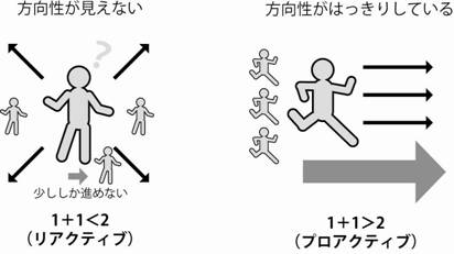 では一歩先に行動するすればよいのかというとそれだけではありません。10名の踏み出す1歩が同じ方向ではなく、バラバラに踏み出したならそれは20歩にはなりません。5歩かもしれません。